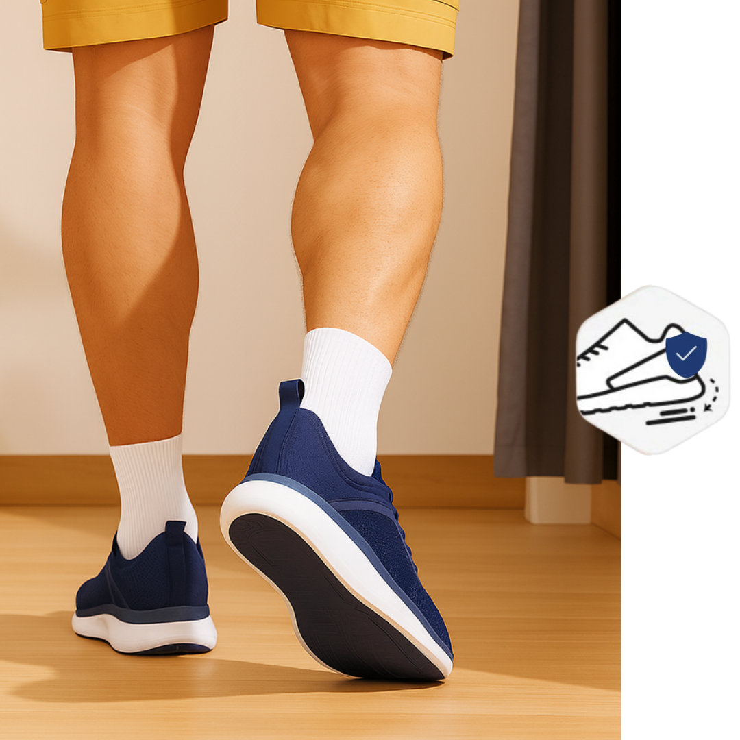 Nuestra suela de EVA de alto rebote proporciona un soporte estable y una absorción superior de impactos que cuida tus articulaciones. Además, su patrón antideslizante cóncavo–convexo en la parte inferior asegura una tracción firme y protección total, incluso en superficies resbaladizas.