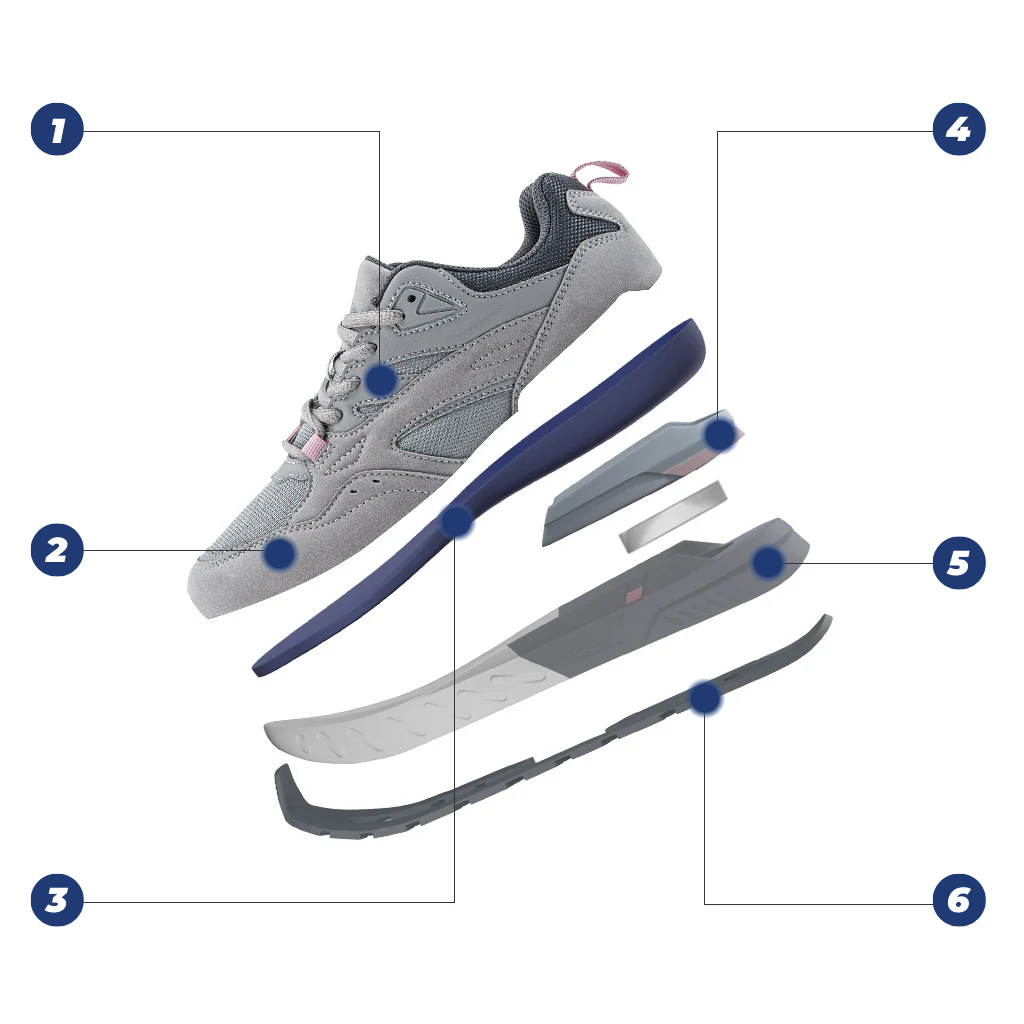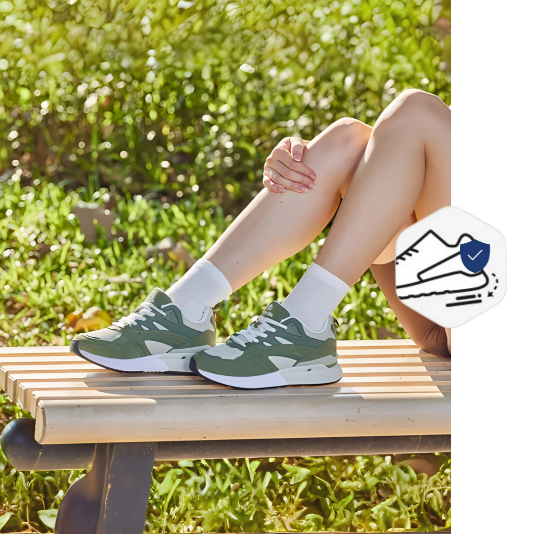 Nuestra suela de EVA de alto rebote proporciona un soporte estable y una absorción superior de impactos que cuida tus articulaciones. Además, su patrón antideslizante cóncavo–convexo en la parte inferior asegura una tracción firme y protección total, incluso en superficies resbaladizas.
